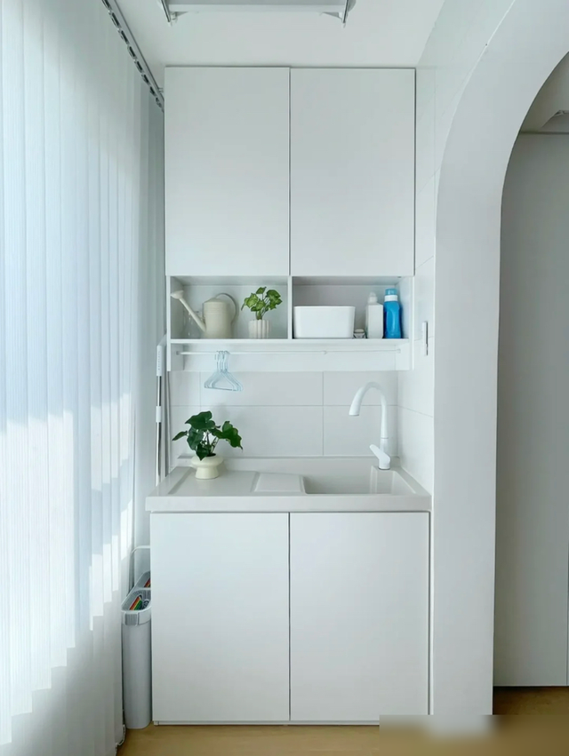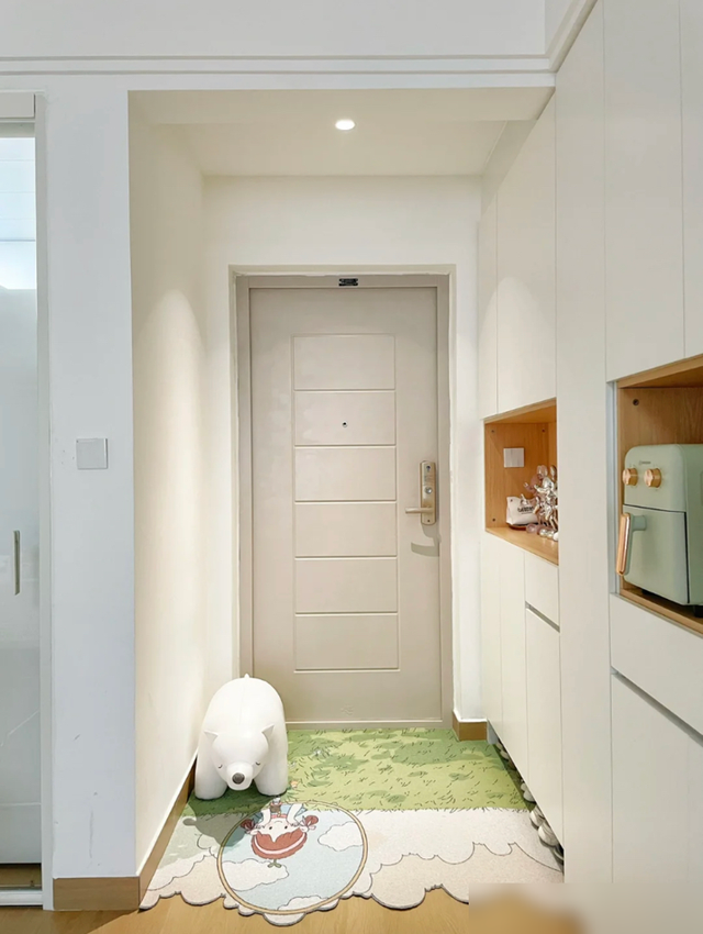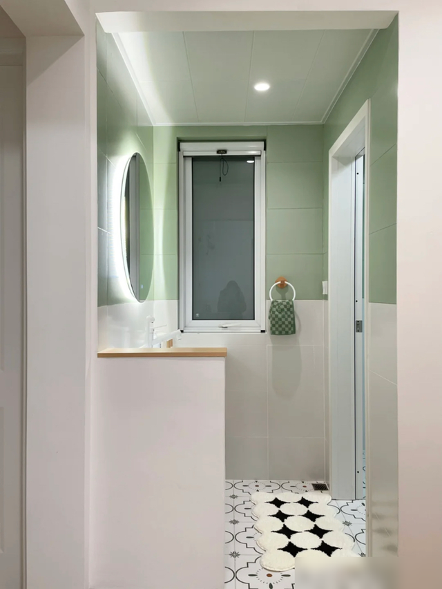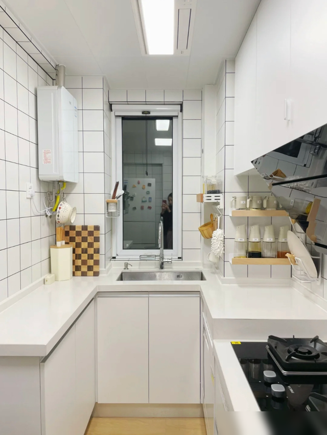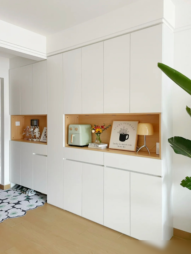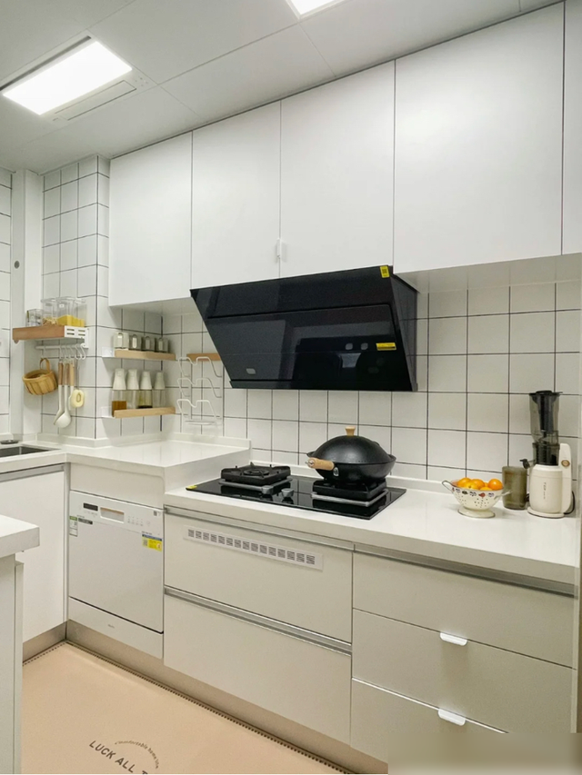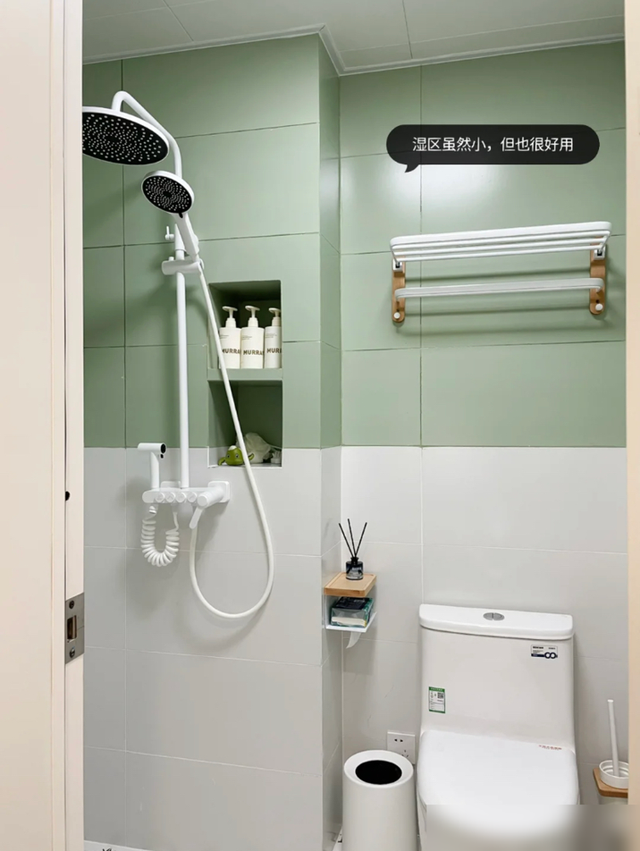 细节处理也很值得借鉴,鞋柜餐边柜一体省空间,木纹砖通铺显大又环保,连花洒都选白色避免水渍,小户型学会这些“抠细节”的巧思,实用性直接翻倍。厨房虽小但收纳满分,免打孔置物架、统一色调的厨具,证明过日子不一定要花大钱,合理规划才是王道。
